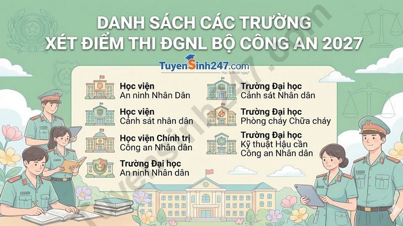 Kỳ thi ĐGNL của Bộ Công an được đánh giá là bước sàng lọc quan trọng, kết hợp cùng kết quả học tập và điểm thi tốt nghiệp THPT để xét tuyển vào các trường Công an nhân dân. Với đặc thù ngành học, thí sinh dự thi còn phải đáp ứng tiêu chuẩn chính trị, sức khỏe, lý lịch theo quy định của Bộ Công an. Dưới đây là danh sách các trường Đại học, Học viện trên cả nước sử dụng điểm thi ĐGNL của Bộ Công An để xét tuyển tính đến thời điểm hiện tại: